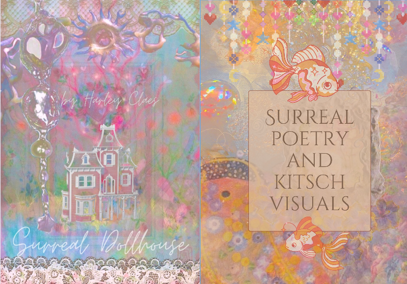 100 pages of collaged pages and surreal poetry, Surreal Dollhouse Poems is a deep dive into the subconscious of an anachronistic voyager, toying with word play and the vintage kitsch- shabby chic aesthetic.
